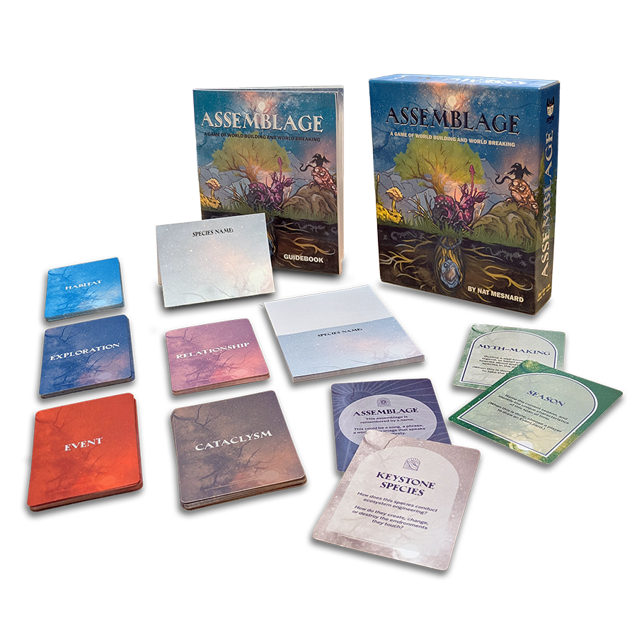 Assemblage is a card-based eco-fantasy storytelling game for 2-6 players where each player portrays an entire species—and collaborates in crafting an interdependent ecosystem on the verge of collapse. You'll begin by collectively choosing a strange and mysterious habitat. Then you will draw prompt cards and take turns describing the assemblage of species living there: history, relationships, adaptations, and myths. Then you'll encounter an epic environmental disaster—and explore what it means to survive.