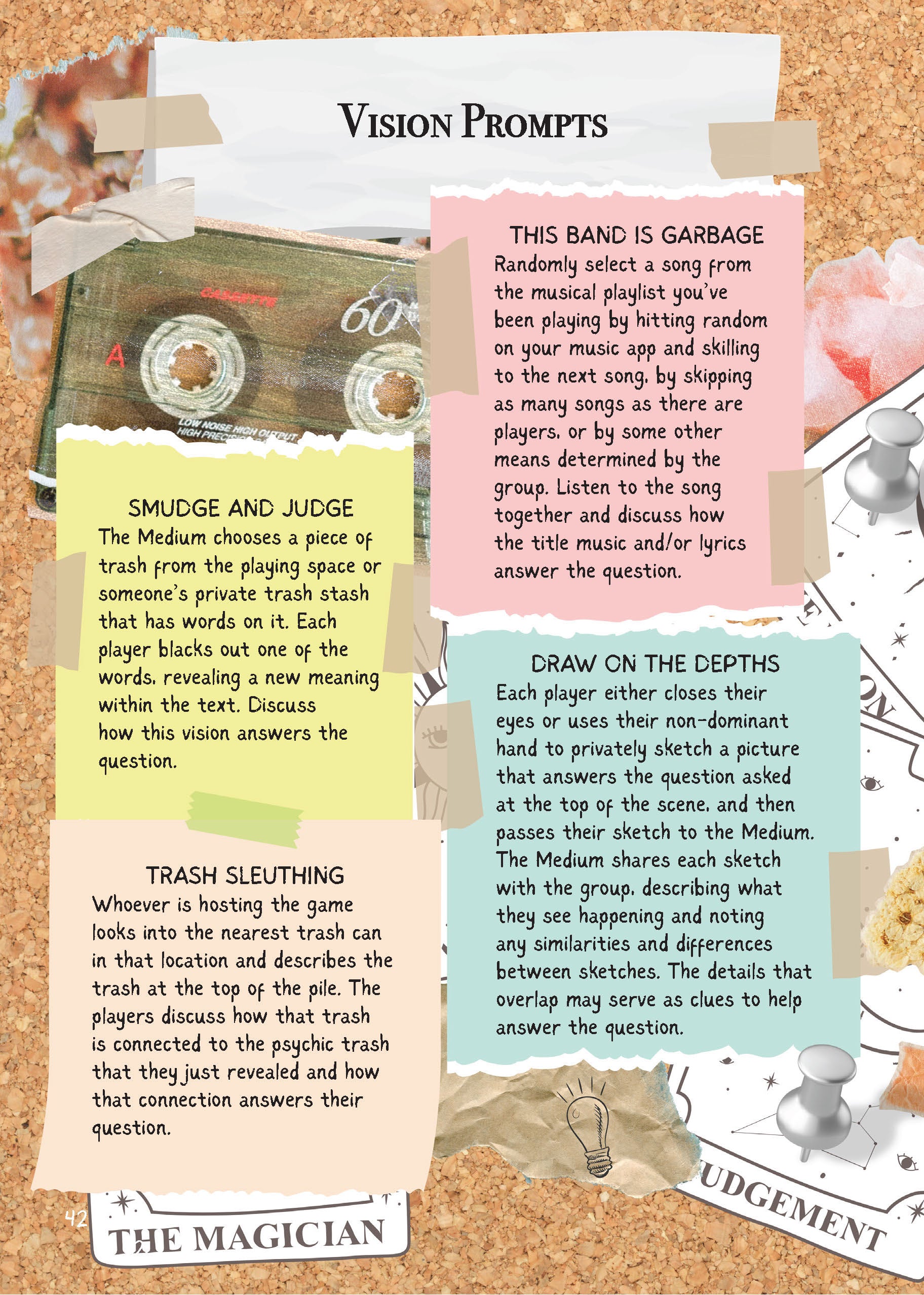 Explore your map and experience psychic visions by doing vision prompts like SMUDGE AND JUDGE or MEMORY COLLAGE to solve the mystery!
